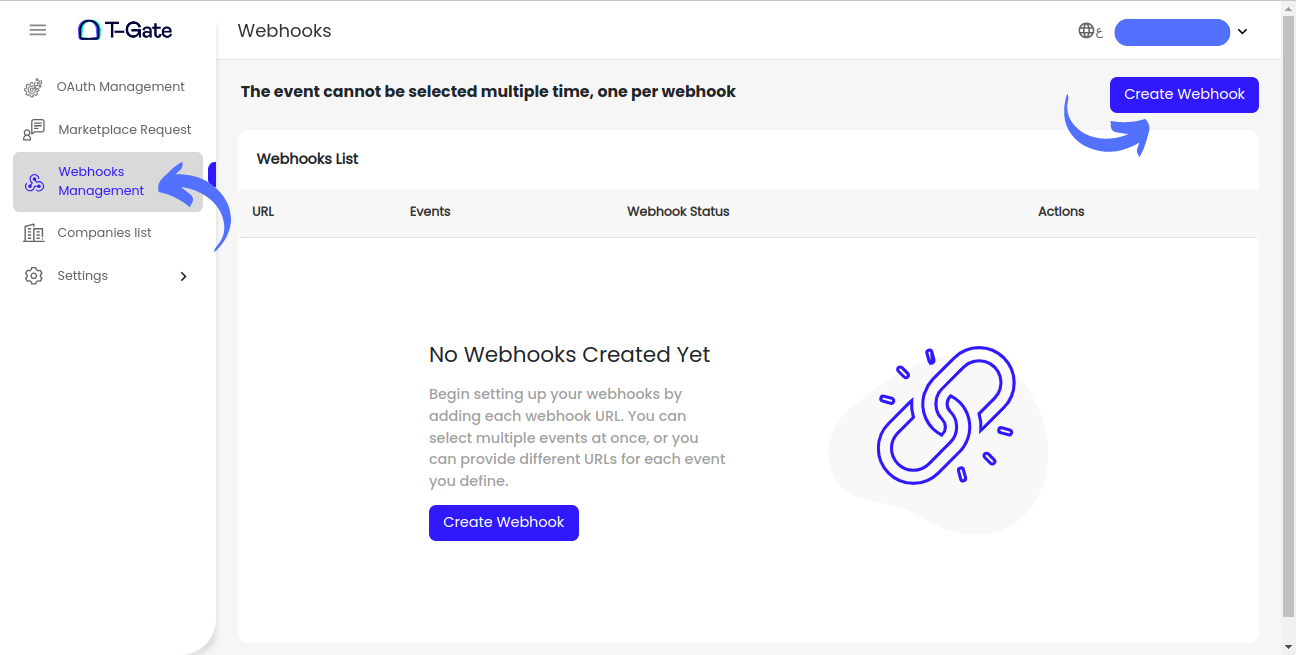 Navigate to the Webhook Management Section: Access this section in your application account on T-Gate's platform.