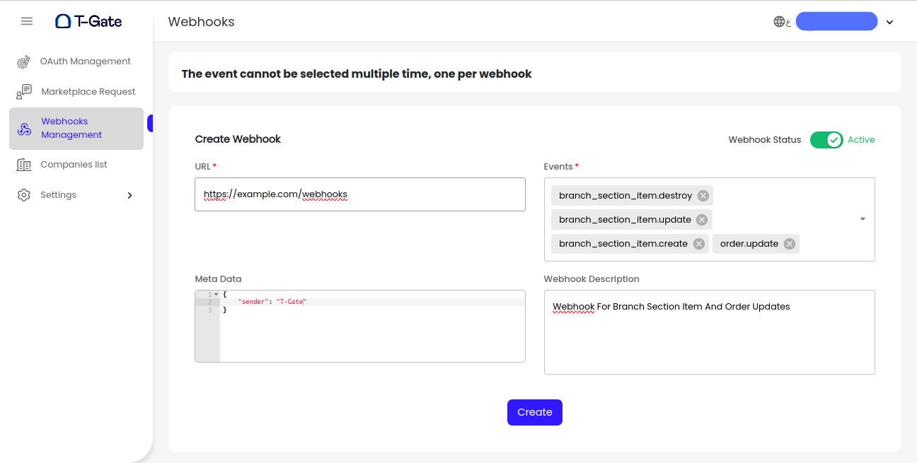 - Meta Data (Optional): Add any extra static data to be sent with every webhook. T-Gate will not process this data; it will be sent as is.