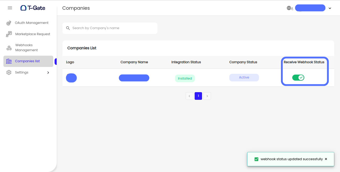 Toggle the "Receive Webhook Status" Button: Switch this button on for the companies from which you want to receive webhooks. This will activate webhook notifications for the events you set in step 1 for those companies.